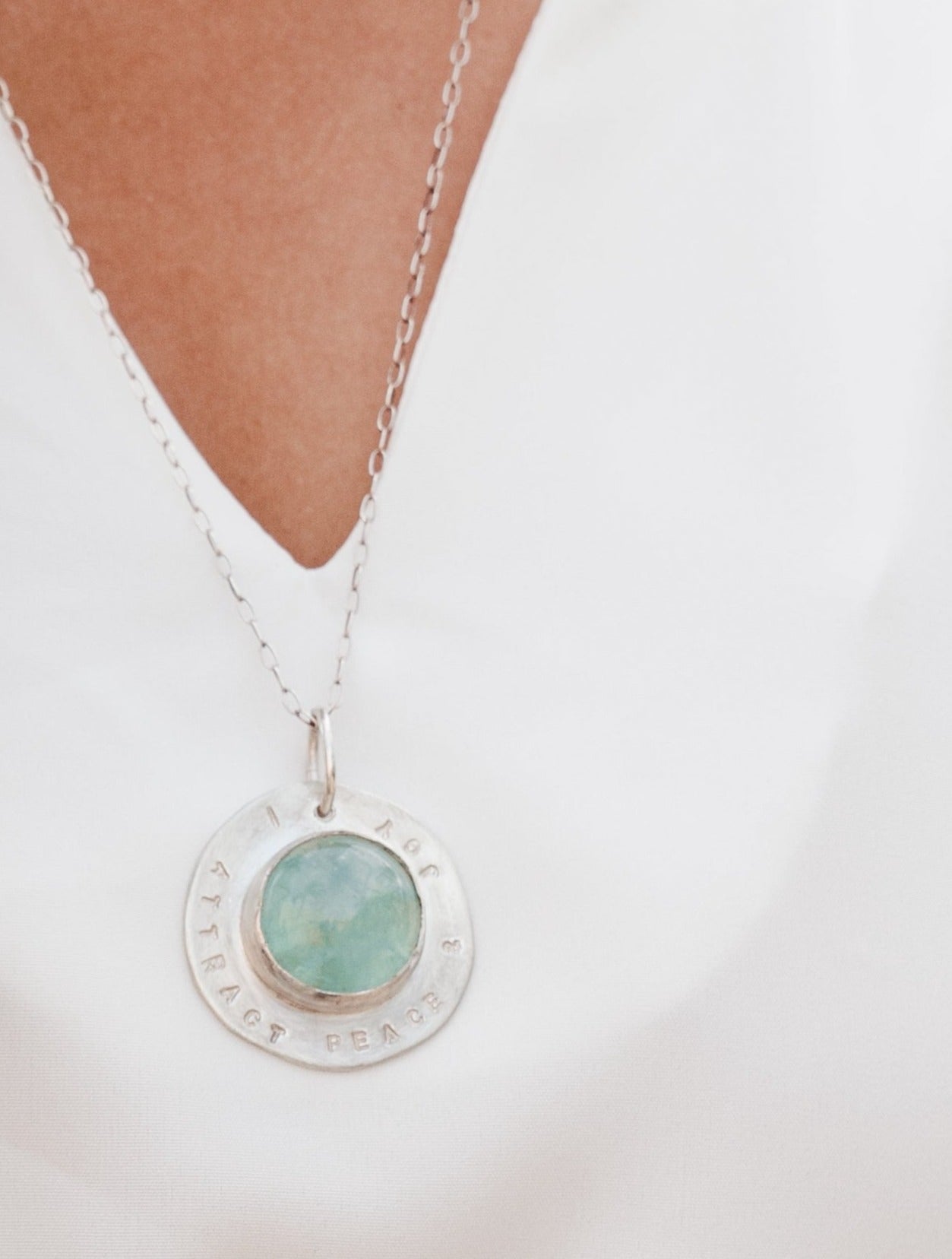 2. Hand-Stamped Affirmation: The heartfelt affirmation "I attract peace & joy" is meticulously hand-stamped onto the sterling silver bezel. This personal touch adds a unique and meaningful element to the necklace.