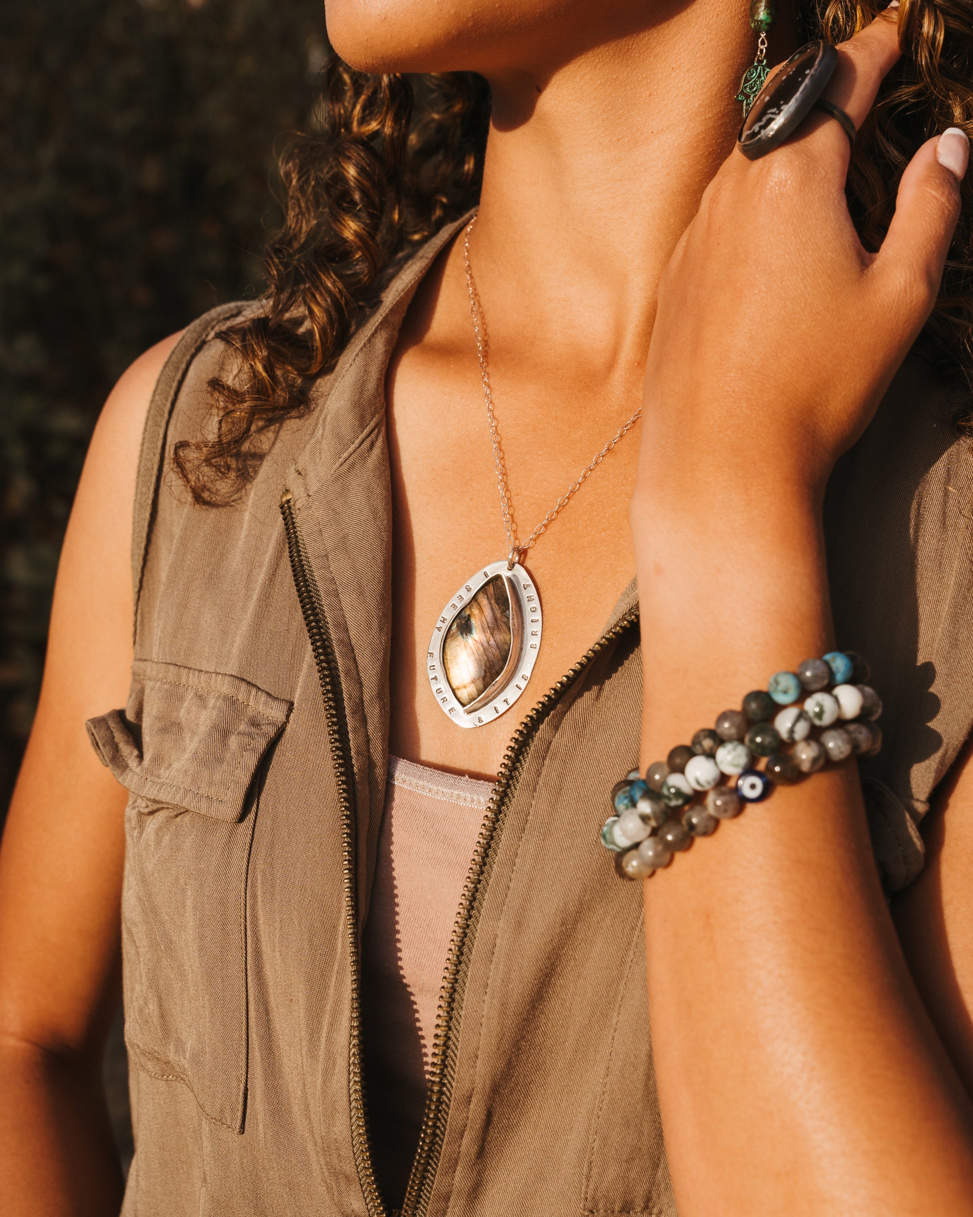 1. Genuine Labradorite Stone: The centerpiece of this necklace is a genuine labradorite stone. Known for its mystical, iridescent quality and transformative energies, labradorite encourages inner vision and positive change.