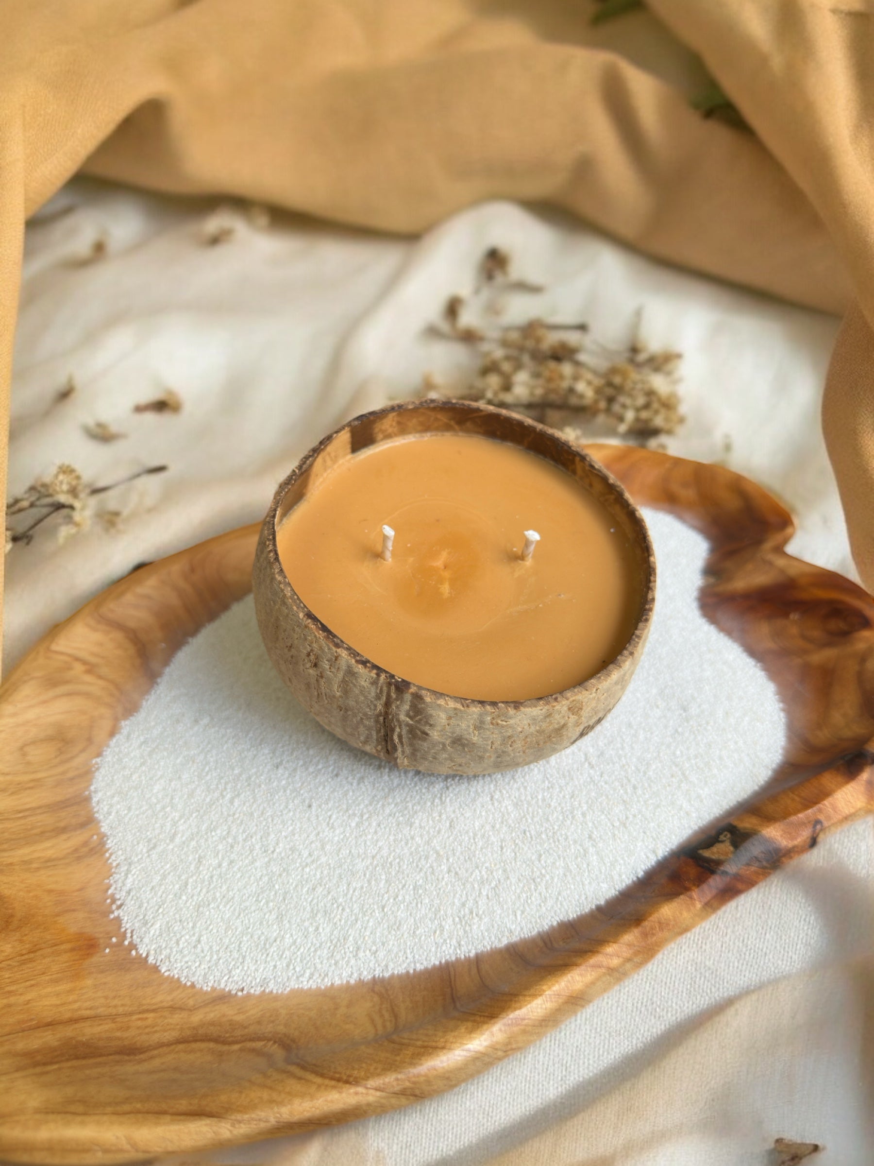 Coco Candle | Teakwood & Tobacco- hand poured soy and coconut wax candle in a reusable natural coconut shell