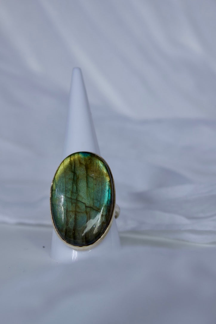 Unleash your inner power and embrace the mesmerizing beauty of our handcrafted Labradorite Ring. Designed in size 8.5, this stunning statement piece features a large Labradorite stone that shimmers with captivating multi-color flashes, reflecting the magic and mystery of the natural world. Carefully crafted for both beauty and comfort, this ring is a talisman of transformation and empowerment.