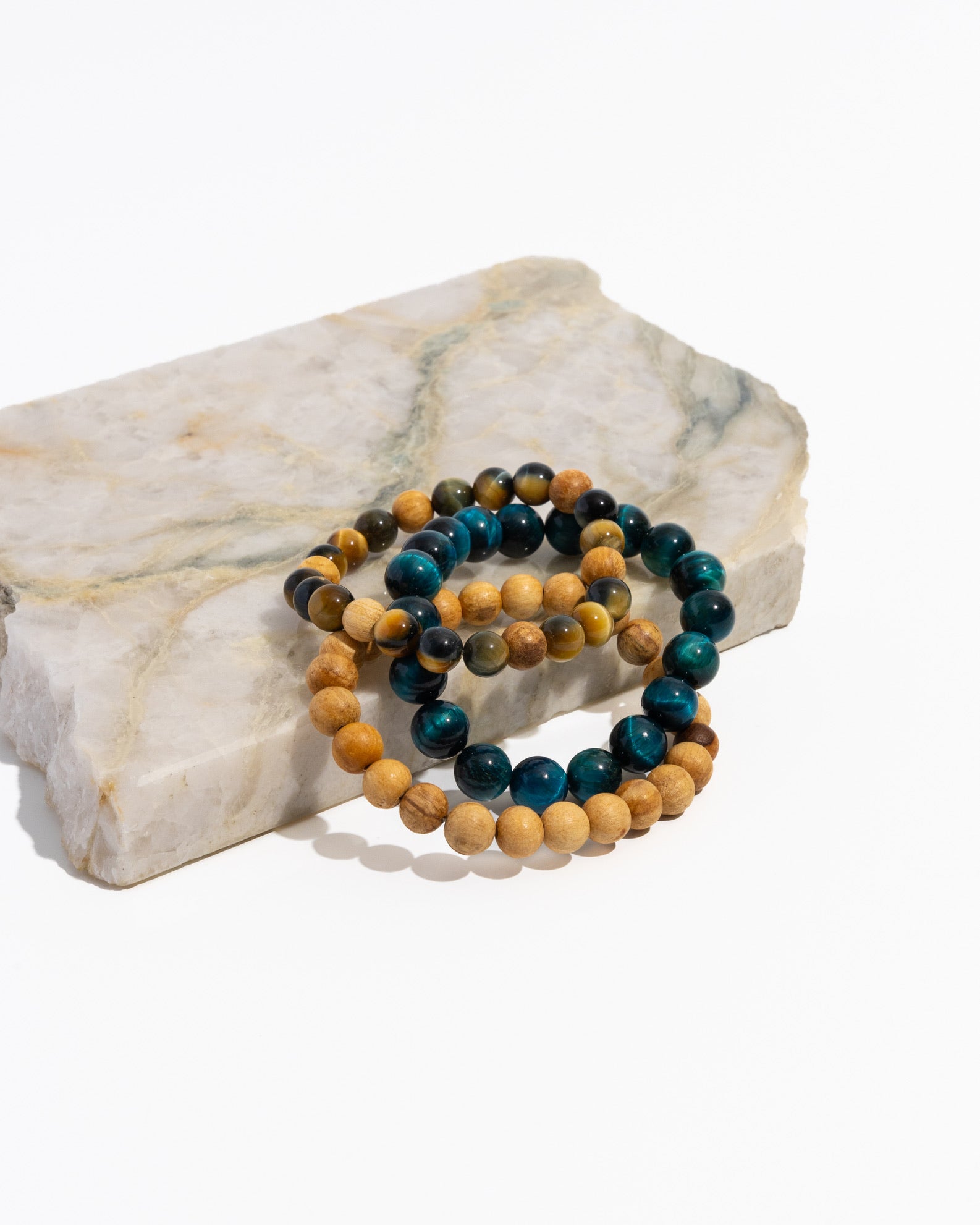 Discover the perfect blend of beauty and protection with our exclusive gift set & bracelet stack, featuring three distinct malas: Blue Tiger's Eye Mala, Blue Gold Tiger's Eye and Palo Santo Mala, and Palo Santo Diffuser Mala. This elegant set is designed to ward off negative and toxic energy while adding confidence, protection, & a touch of sophistication to your style.