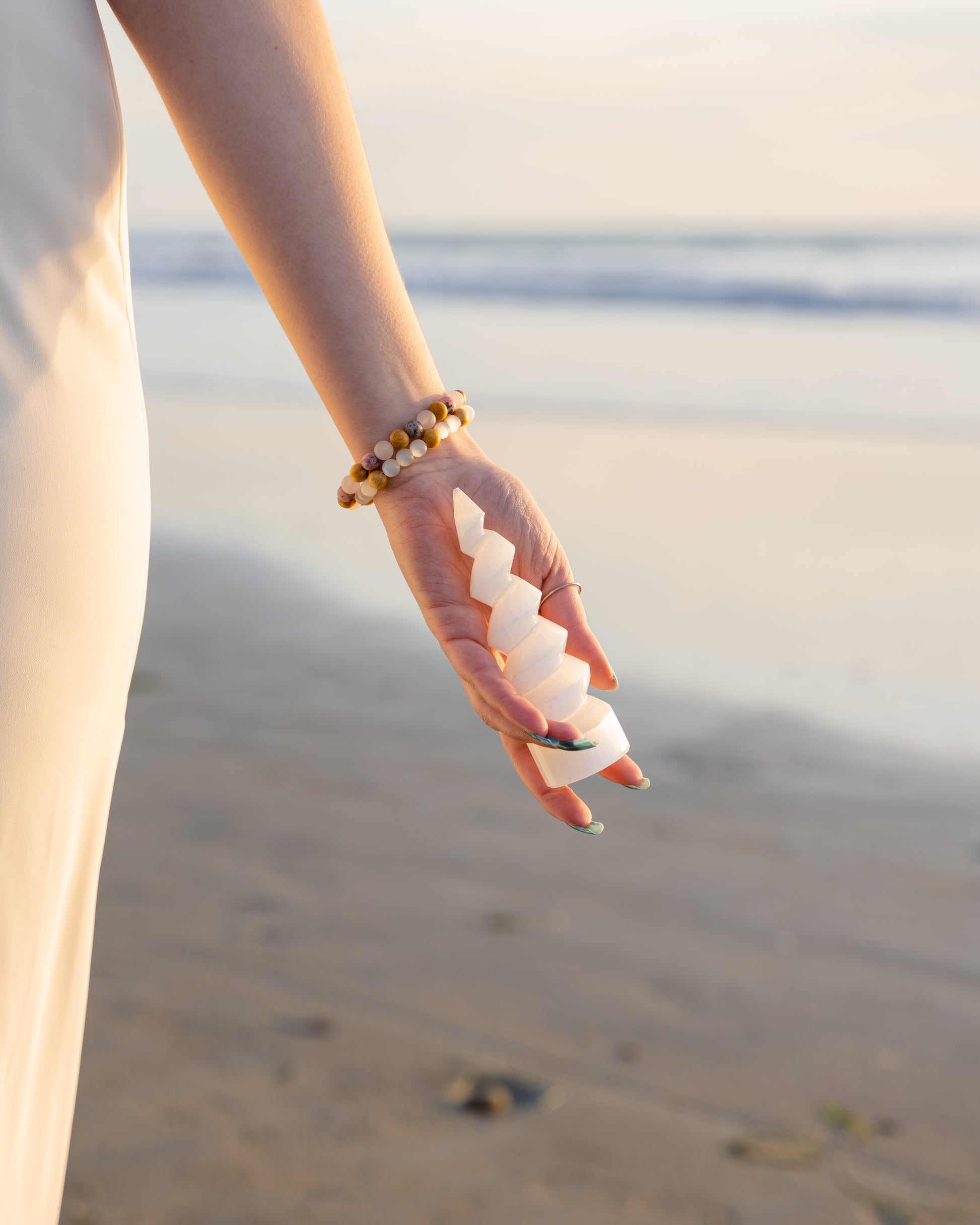 Enhance your meditation practice with our Selenite Meditation Tower. This stunning and unique tower is expertly handcrafted from high-quality selenite, chosen for its calming and soothing energy and unique formations.