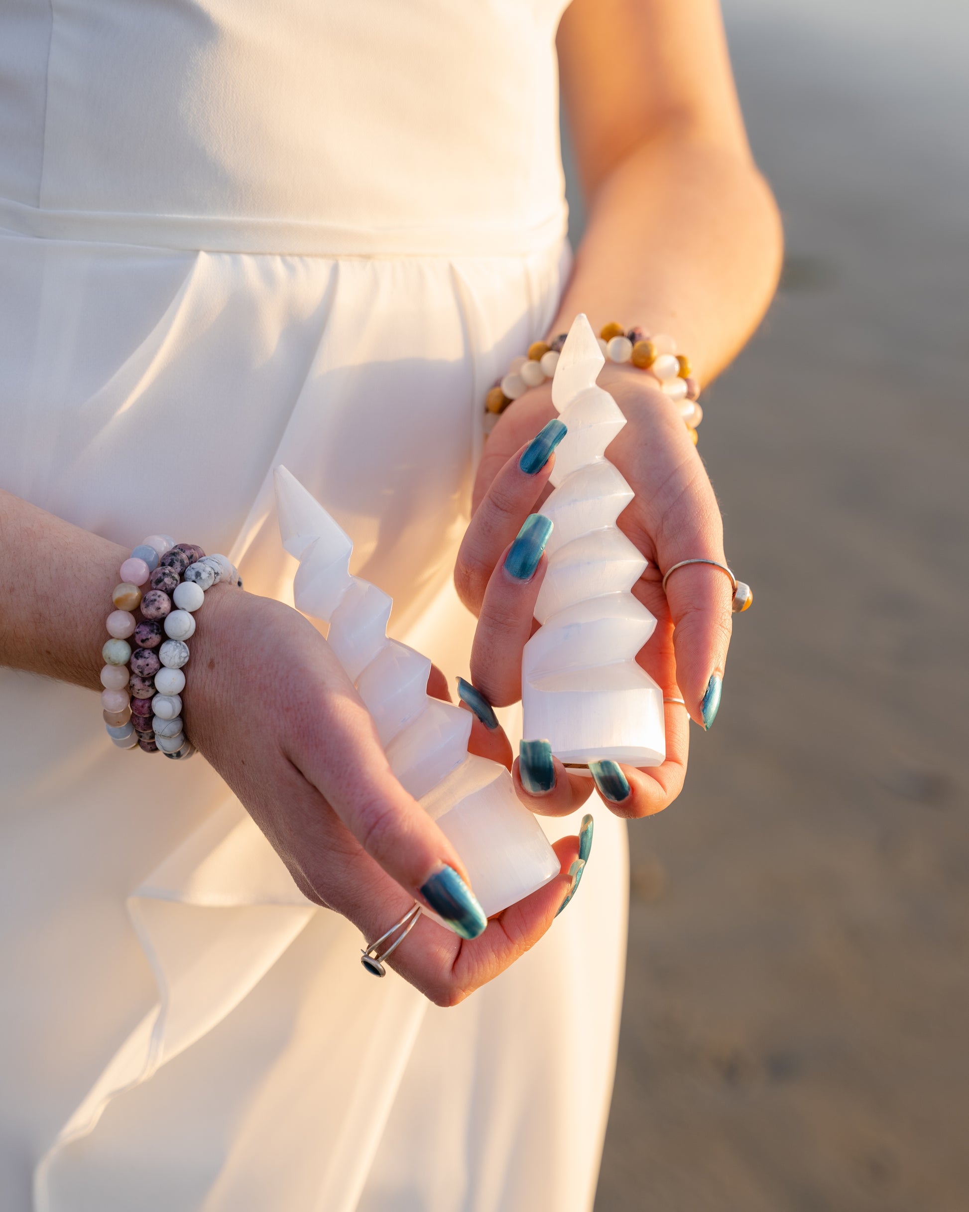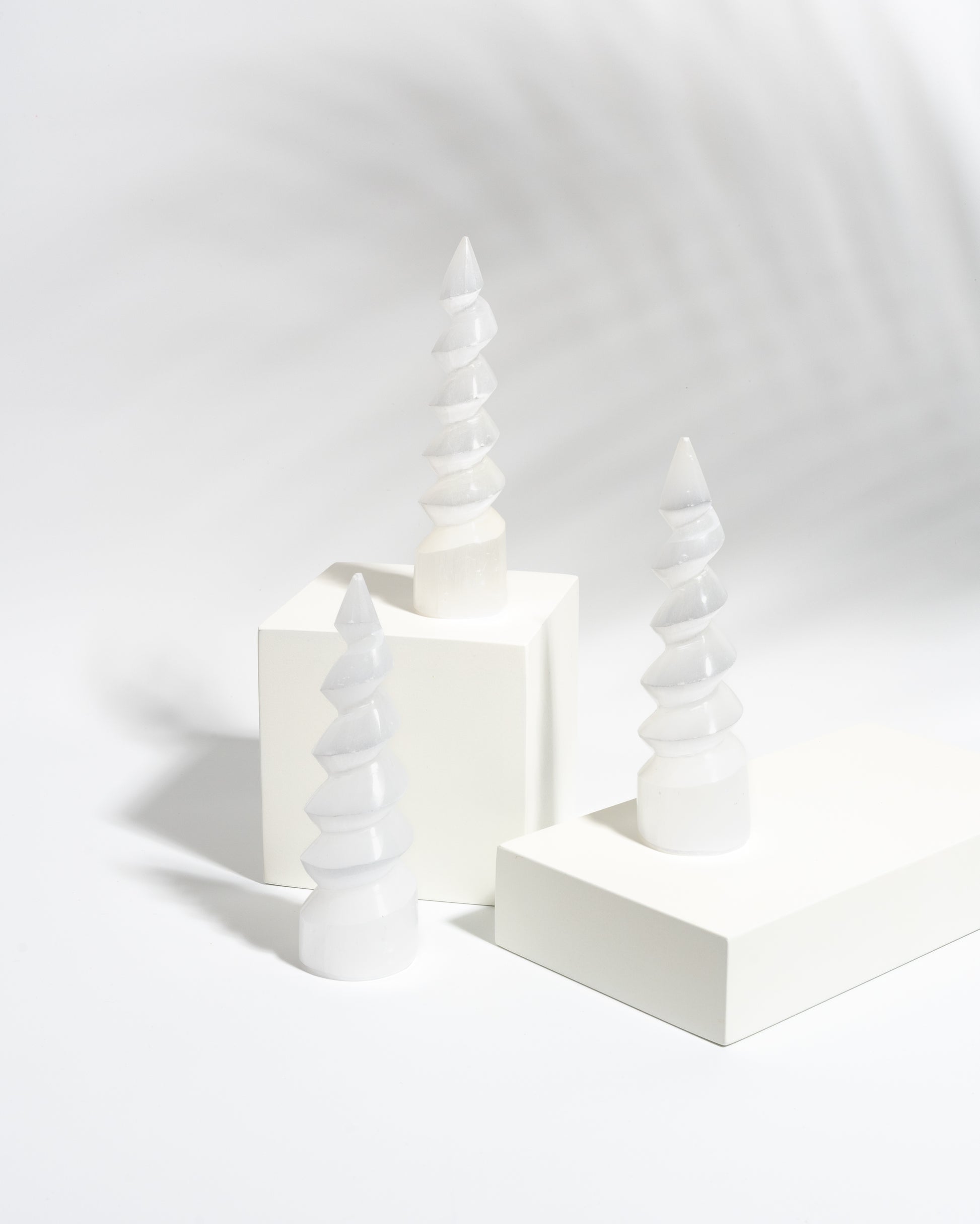Each tower is carefully handcrafted to create a unique and one-of-a-kind spiral design. The natural reflections of the selenite crystal make each tower truly unique, adding to the beauty and uniqueness of your collection.