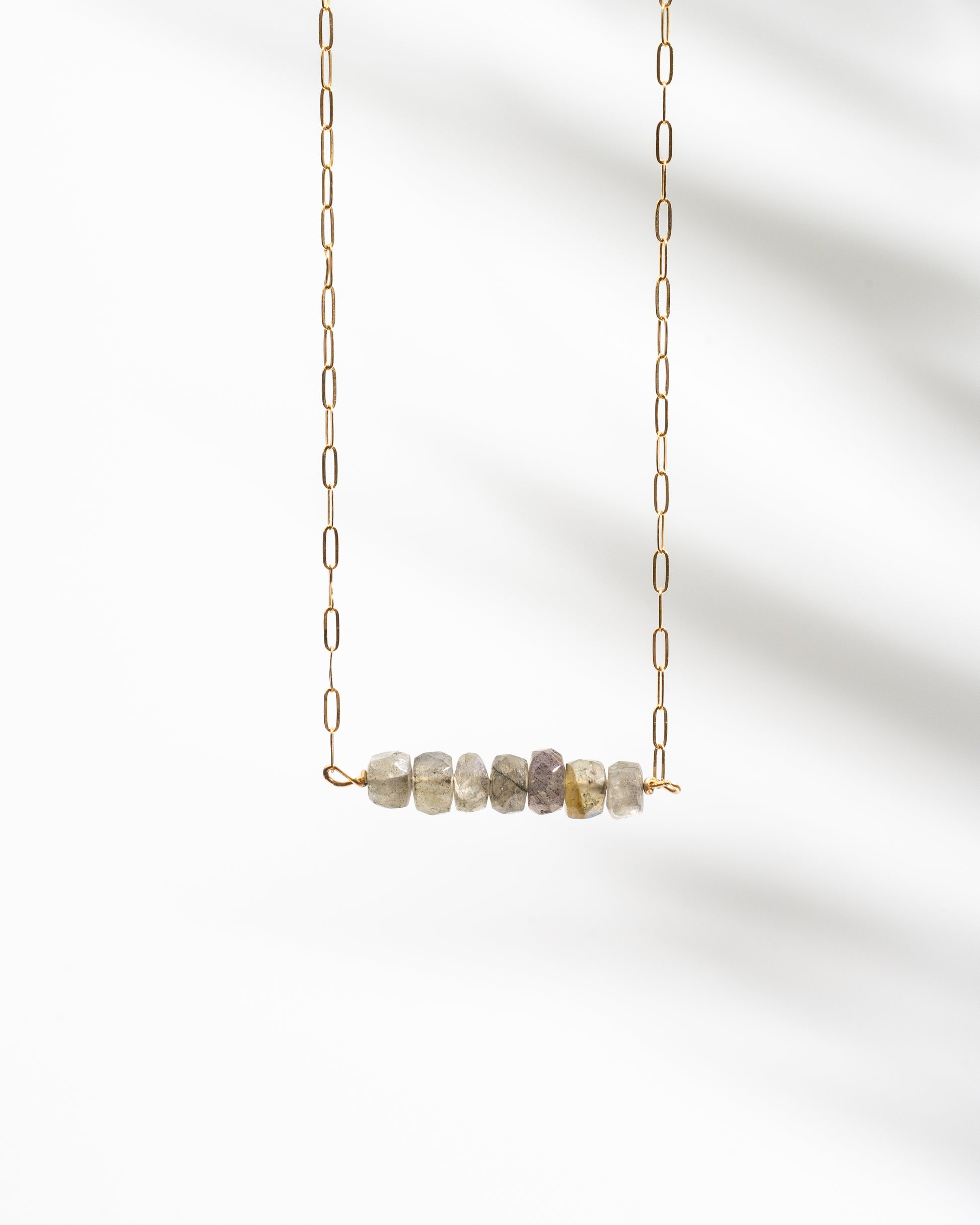 - Faceted Flashy Labradorite Gemstones: Delve into the magical world of labradorite with this captivating bar necklace. Each labradorite gemstone is carefully faceted to enhance its natural flash, showcasing a spectrum of iridescent colors that dance with every movement. The bar pendant design creates a sleek and contemporary aesthetic that effortlessly adds a touch of mystique to your outfit.